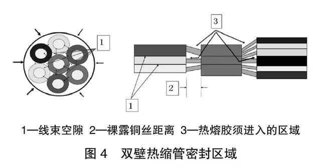 在双壁热缩管收缩的过程中,线束被挤压在一起,热熔胶很难穿透进入到线束中间的空隙中。热熔胶须进入导线压接部位并形成密封效果。