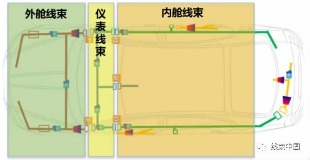 遵循易于生产装配的原则,并且考虑到成捆线束穿线时的最大投影面,四门线束、尾盖线束、前后保险杠线束一般作为除车身主线束以外的小线束单独安装。贯穿发动机舱和乘客舱的车身主线束总成可以分为3个分段:外舱线束、仪表线束以及内舱线束,如图1所示。文章源自线束工程师之家-https://suncve.com/research-and-analysis-of-automobile-wiring-harness-topology/