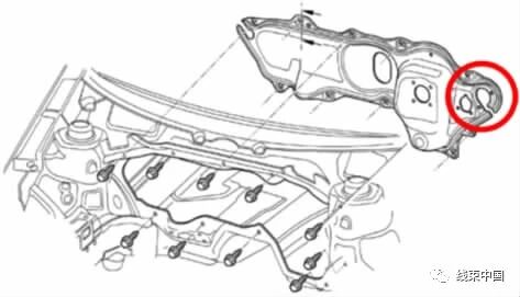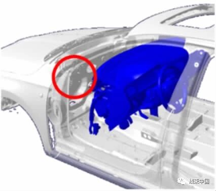 1) 外舱采用固定在蓄电池正极且体积相对较小的主熔断丝盒或作为一次件(总装车间负责装配) 的发动机舱熔断丝盒。这种情况下,在装配时,先将外舱线束装入保护套中,随后从内舱穿过前围板的钣金孔抵达外舱。在这过程中,外舱线束的最大投影面积受开孔尺寸的限制,即线束最大投影面积需要小于钣金孔,如图3所示,其中红圈处为线束在前围板的固定位置。